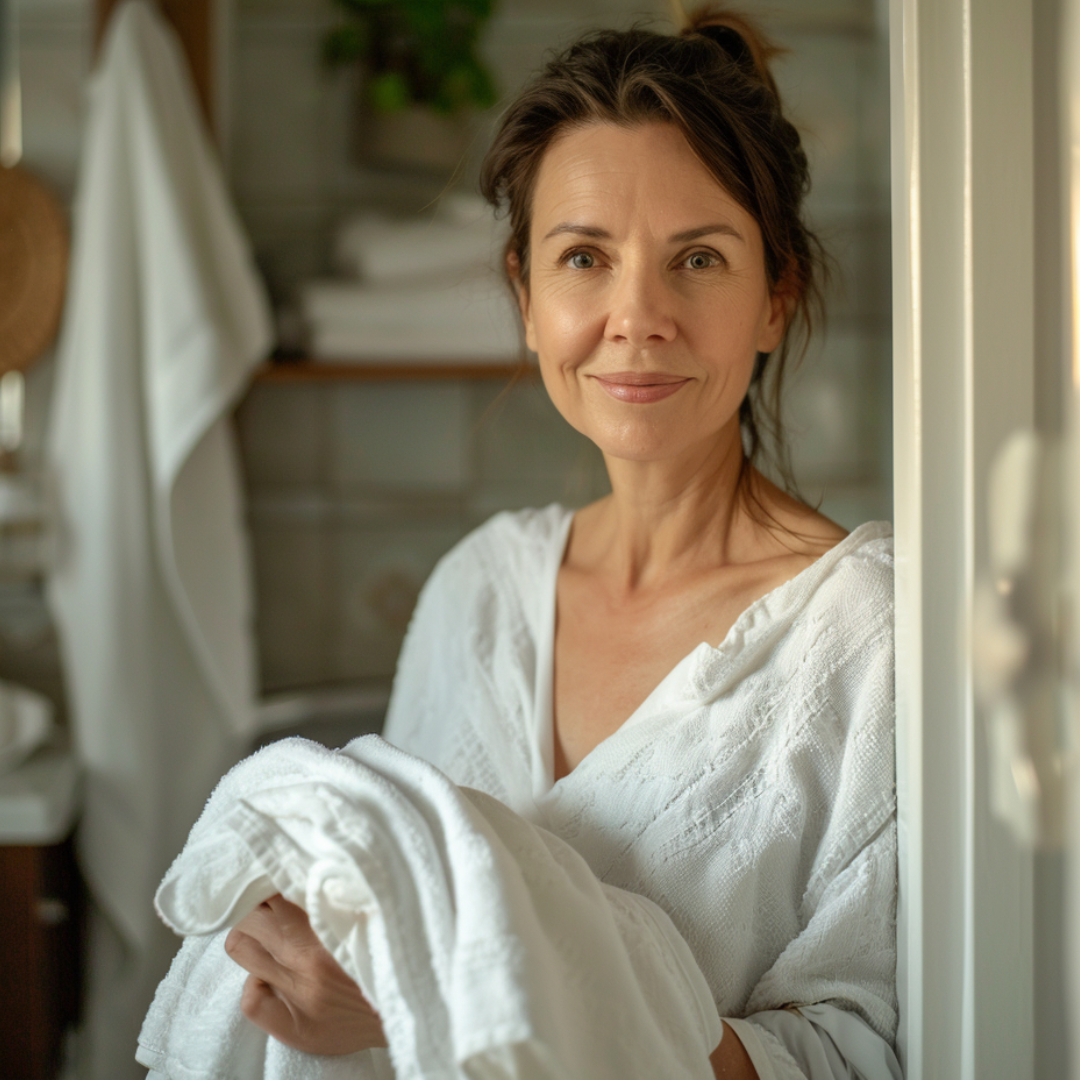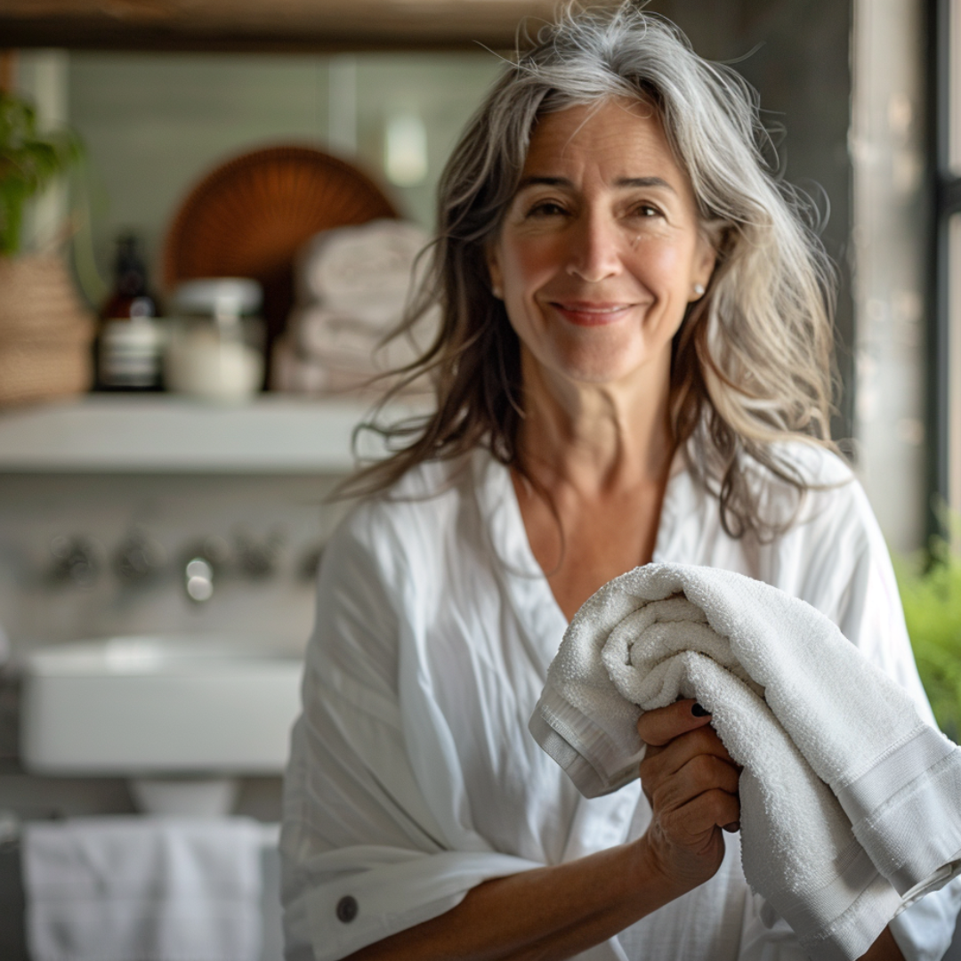 • Pour que vos serviettes et votre peignoir restent doux et absorbants , lavez-les à l'eau froide ou tiède (40 °C maximum) avec une lessive douce et respectueuse des couleurs . Évitez les assouplissants, car ils peuvent réduire l'absorption. Séchez-les au sèche-linge à basse température et retirez-les rapidement pour préserver leur douceur.